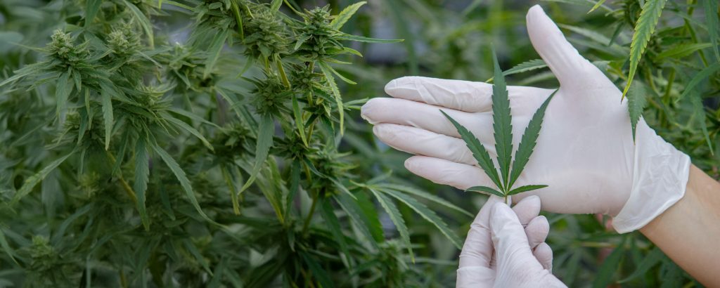 Portrait of scientist checking and analizing hemp plants, The doctor is researching marijuana. Concept of herbal alternative medicine, cbd hemp oil, pharmaceutical industry